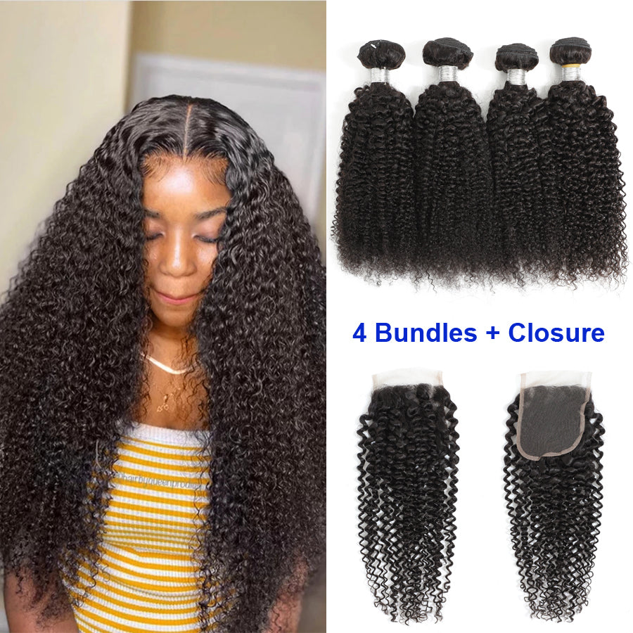 TT Hair Curly Hair Bundles with Closure Transparent Lace Kinky Curly Remy Human Hair 4 Bundles With 4x4 Lace Closure