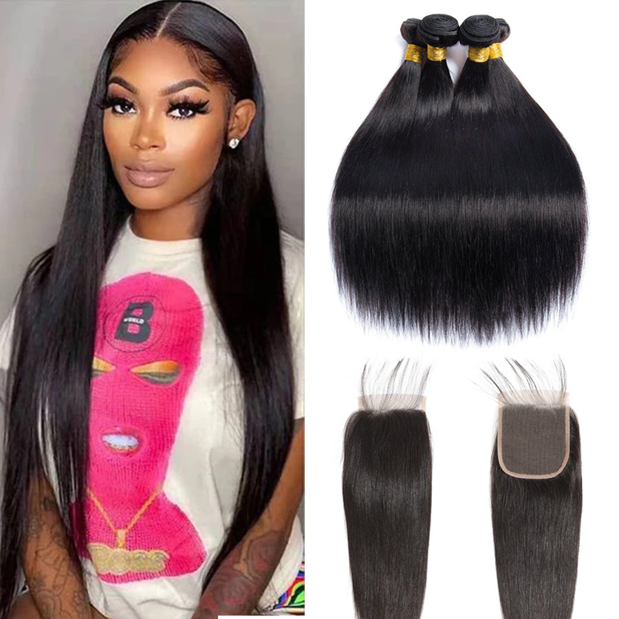 TT Hair Straight Hair 4Pcs Bundles With 4x4 Transparent Lace Closure Brazilian Hair Weave Bundles